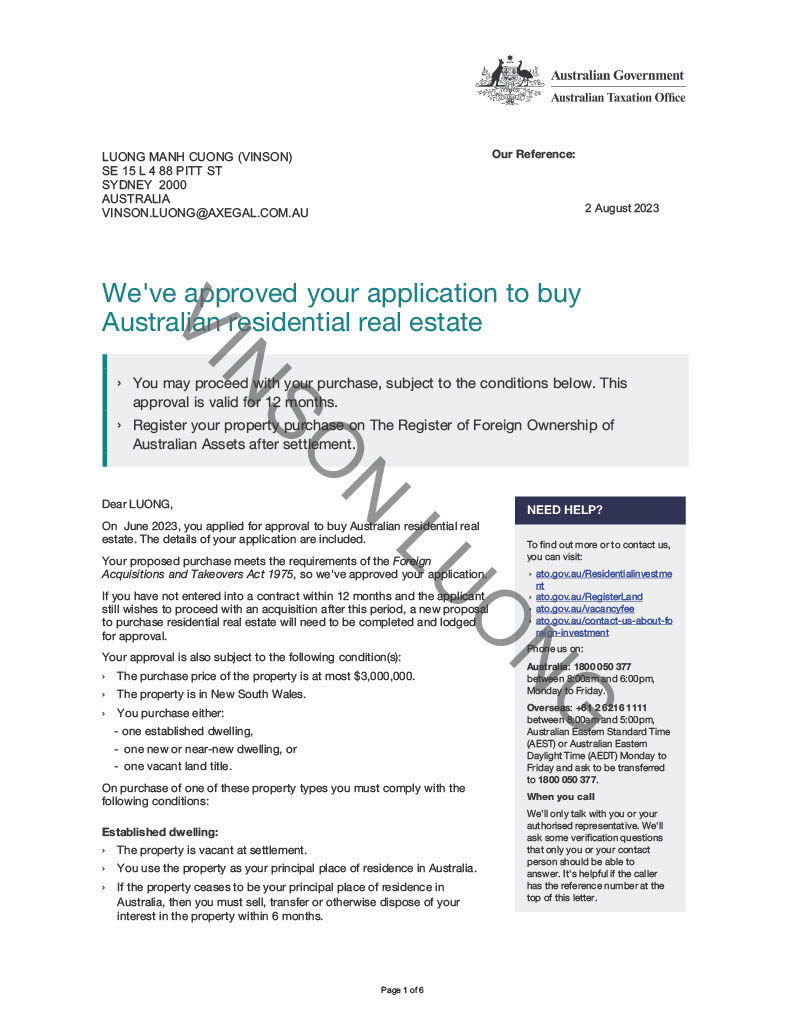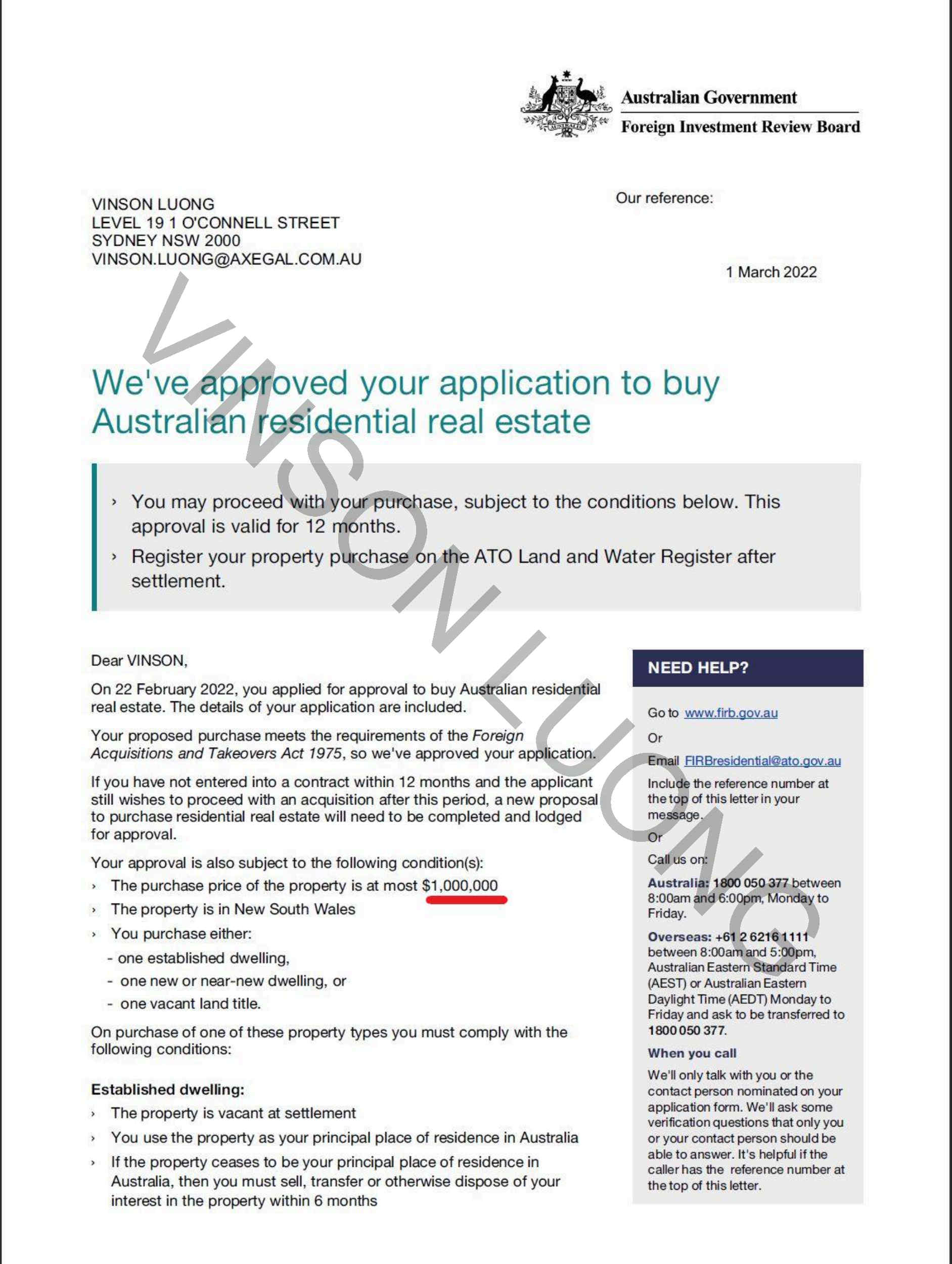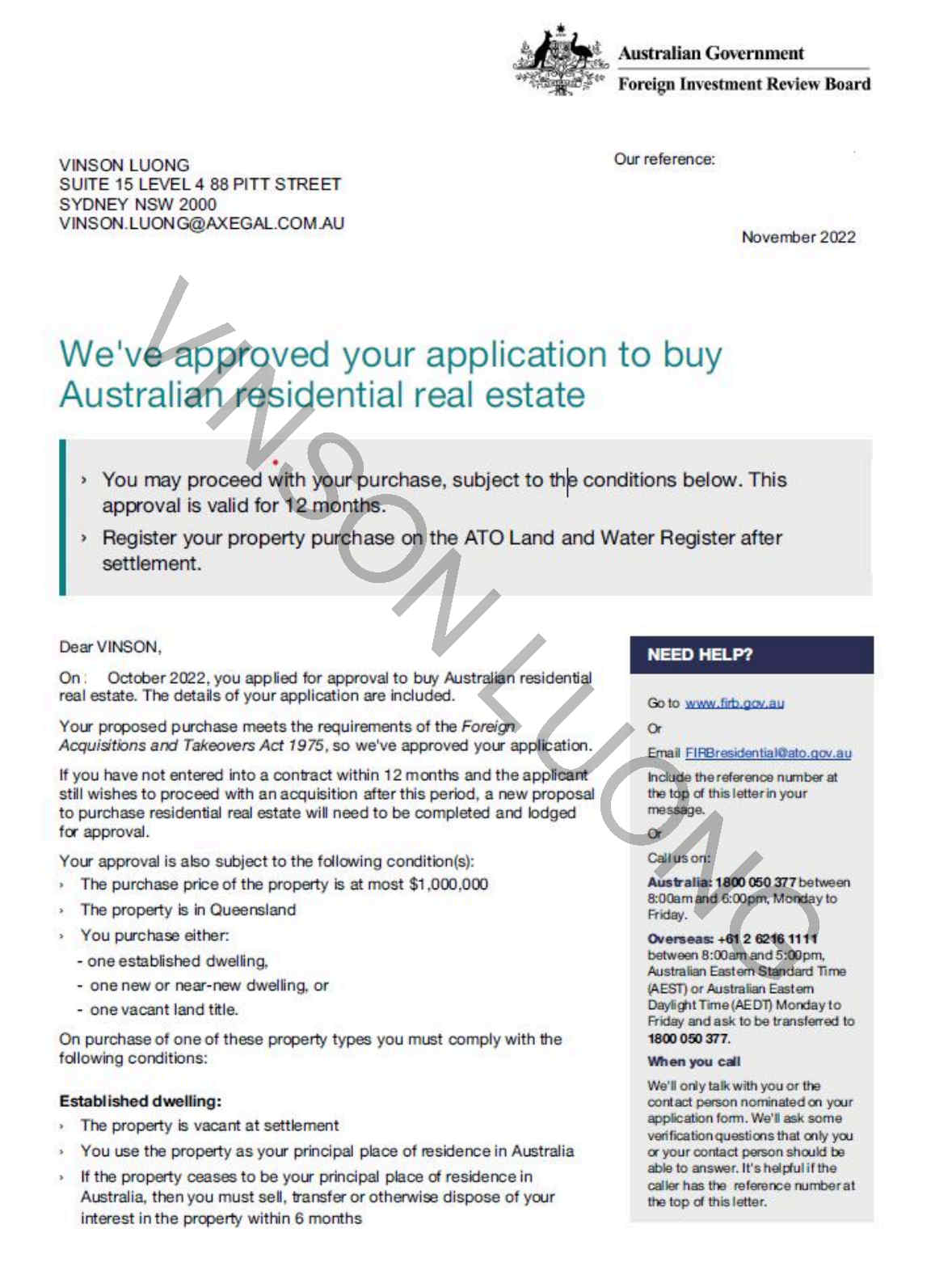 Luật sư Vinson Lương tự hào đã giúp rất nhiều khách hàng thành công trong việc xin phê duyệt FIRB, mua được bất động sản tại Úc. Dưới đây là một số ví dụ về các quyết định phê duyệt của Ủy ban Đánh giá Đầu tư Nước ngoài (The Foreign Investment Review Board, gọi tắt là FIRB) đã cấp cho các khách hàng của Vinson Lương trong thời gian qua.